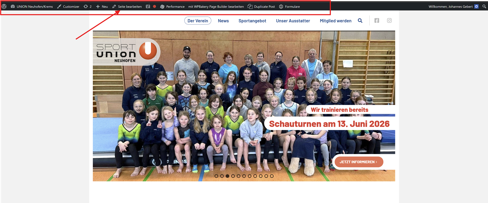 - Klick in der Admin-Leiste oben auf „Seite bearbeiten" – du landest direkt im Editor dieser Seite