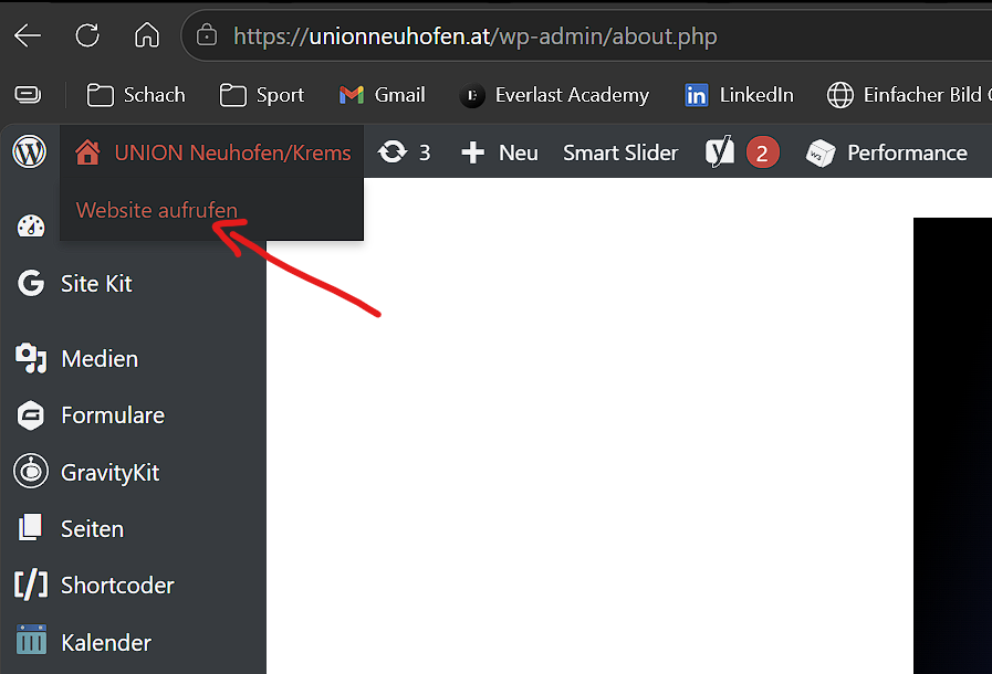 Damit kommst du auf die echte Website – aber eingeloggt. Das hat den großen Vorteil, dass du immer siehst, was die Besucher:innen sehen, und genau dort bearbeiten kannst, wo etwas steht.